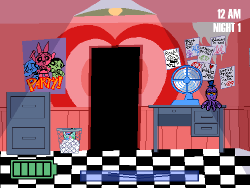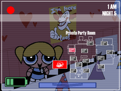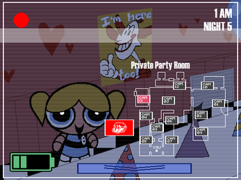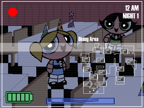 Welcome to the Powerpuff Party Pizzeria! The latest in an attempt to capitalize on real children delicious family fun! You are Wade Slave, a security guard hired to watch the place during the night to keep an eye out for any crooks, as the Girls themselves would be too busy sleeping to look after such a place during such a time. Luckily (or unfortunately), the animatronic mascots here are also capable of dealing with such intrusions! However, they tend to go a bit haywire during the night, so they might go after the wrong target while roaming, which may be you. Can you survive five fights at Blossom's?... whatever the heck that means.